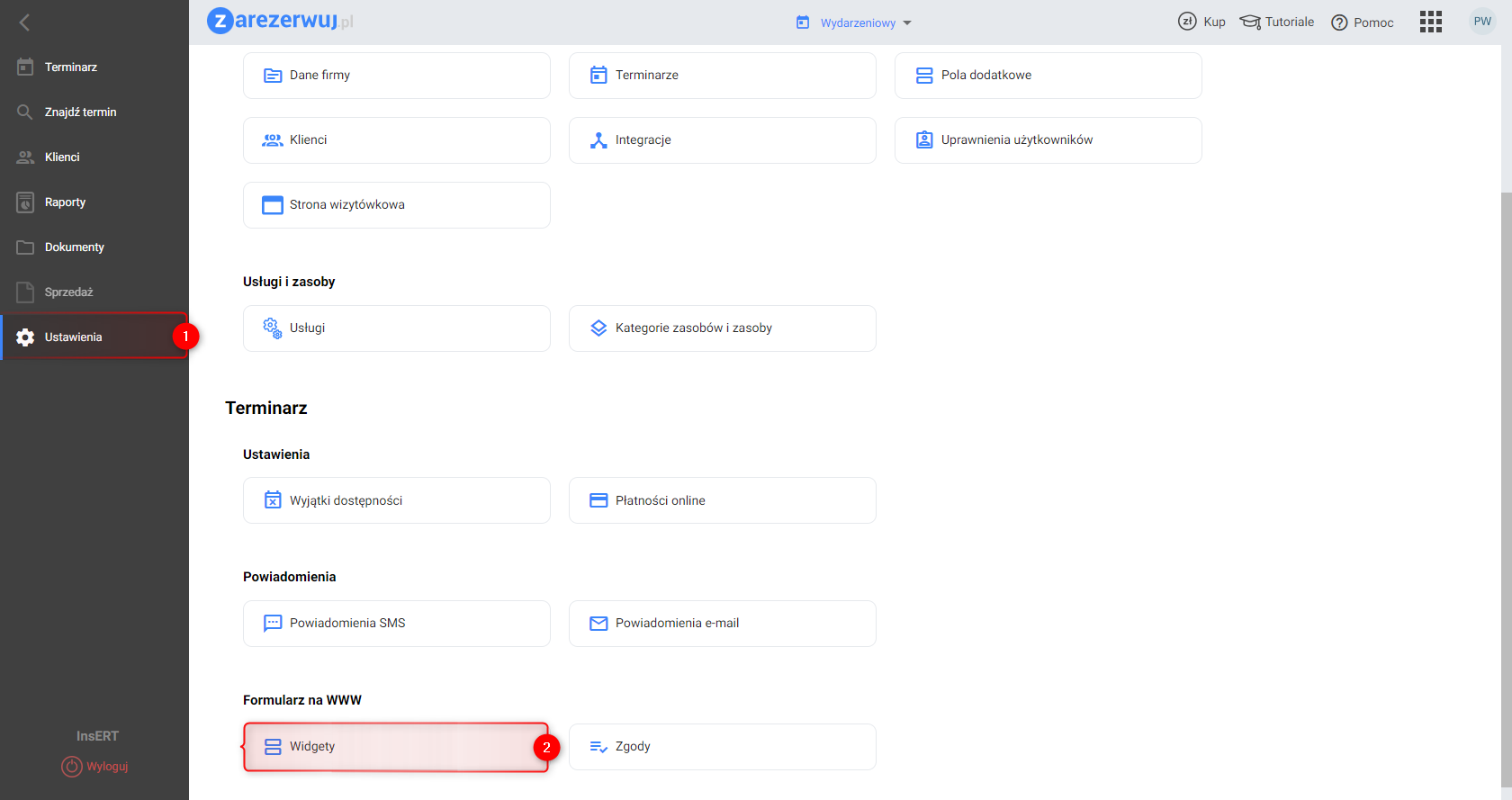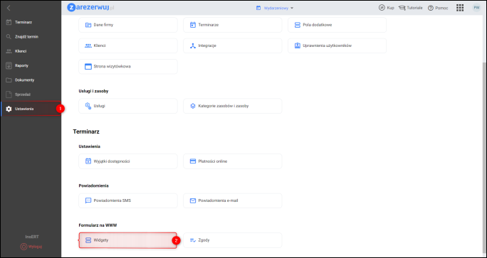1. Zalogować się do aplikacji zarezerwuj.pl. Kliknąć menu Ustawienia, a następnie w sekcji Formularz na WWW, wybrać opcję Widgety.