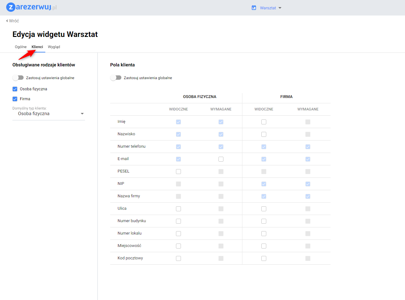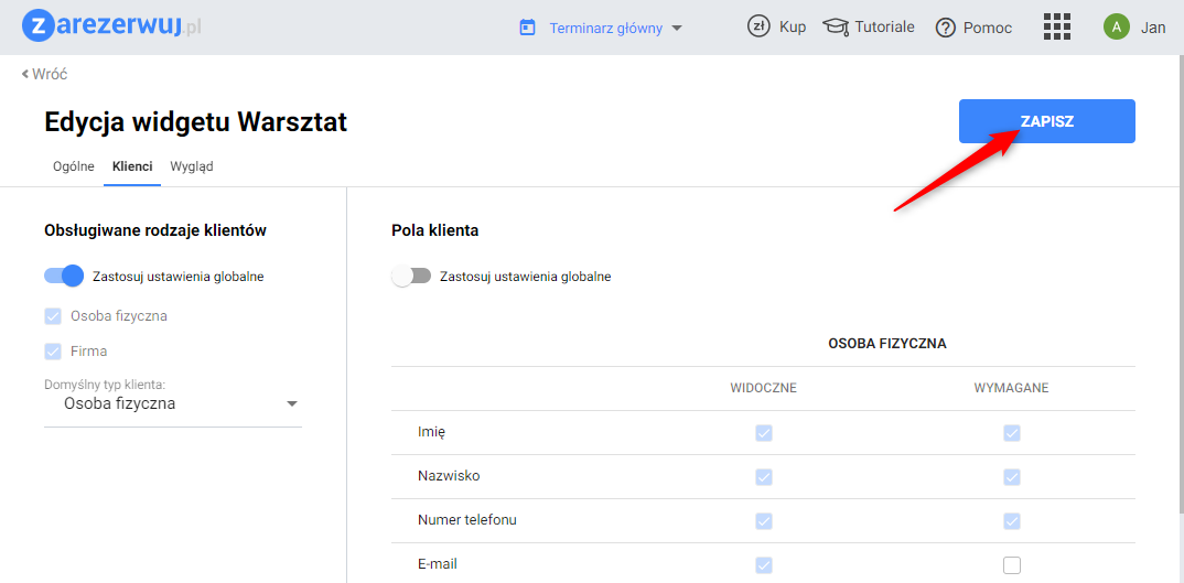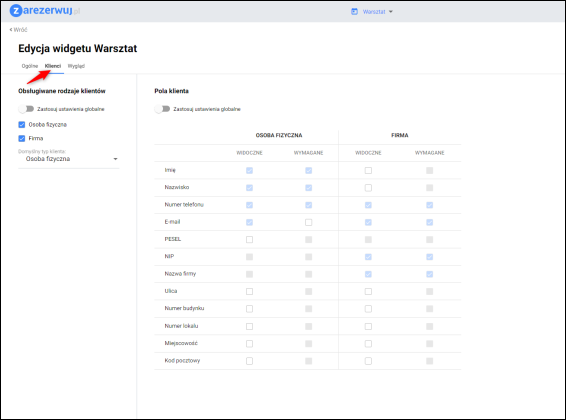 5. W sekcji Pola klienta dostosować wyświetlane i wymagane pola dotyczące klientów na formularzu rezerwacji. Aplikacja umożliwia wprowadzenie odrębnych ustawień dla firmy i osoby fizycznej.