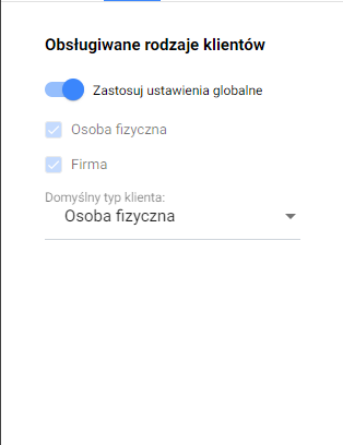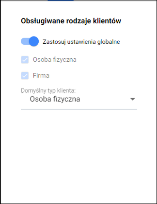 4. Określić jaki rodzaj klientów będzie obsługiwany na formularzu. Aplikacja obsługuje 2 rodzaje klientów: Osoba fizyczna lub Firma. Parametr Zastosuj ustawienia globalne oznacza, że aplikacja będzie stosować parametry z modułu Ustawienia – Klienci.
