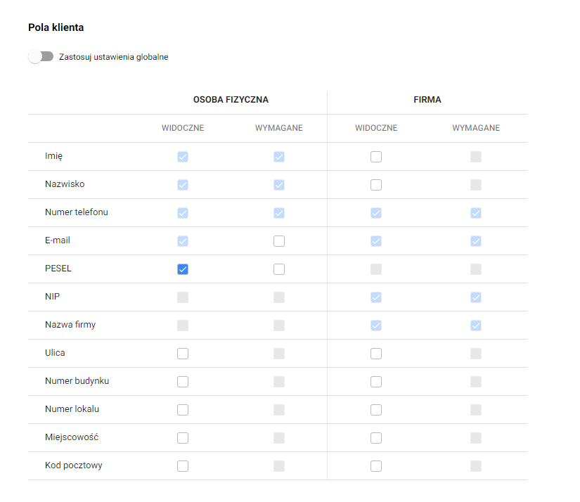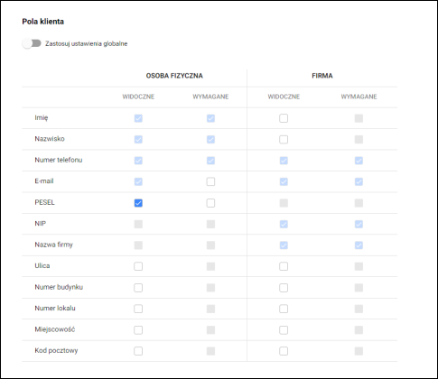 UWAGA !!! Należy pamiętać, że wyłączenie ustawień globalnych pozwala jedynie na zaznaczenie widoczności i wymagalności dodatkowych pól, które globalnie nie są aktywowane. Nie ma możliwości wyłączenia widoczności czy wymagalności pól, które są przypisane globalnie.