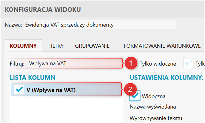 2. Na zakładce Kolumny w polu Filtruj wpisać Wpływa na VAT, zaznaczyć wyszukaną kolumnę na liście, a zmiany zatwierdzić przyciskiem OK.