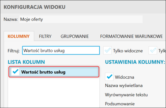 Gestor nexo – Jak do widoku Ofert dodać kolumnę Wartość brutto usług?