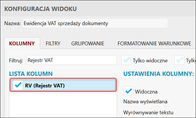 2. Na zakładce Kolumny w polu Filtruj wpisać Rejestr VAT, zaznaczyć wyszukaną kolumnę na liście, a zmiany zatwierdzić przyciskiem OK.
