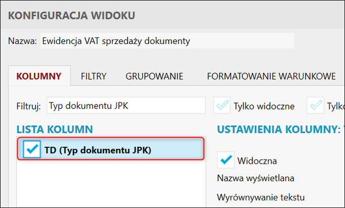 2. Na zakładce Kolumny w polu Filtruj wpisać Typ dokumentu JPK, zaznaczyć wyszukaną kolumnę na liście, a zmiany zatwierdzić przyciskiem OK.