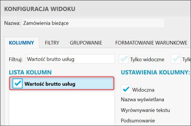Aby dodać kolumnę Wartość brutto usług w widoku Zamówień, należy: