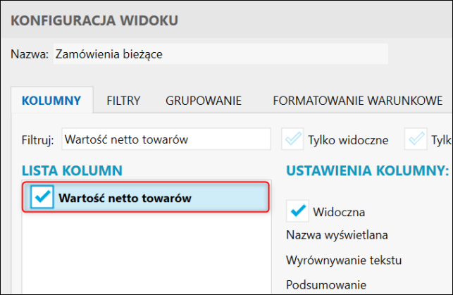 2. Na zakładce Kolumny w polu Filtruj wpisać Wartość netto towarów, zaznaczyć wyszukaną kolumnę na liście, a zmiany zatwierdzić przyciskiem OK.