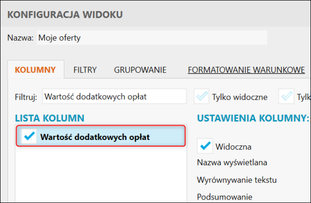 2. Na zakładce Kolumny w polu Filtruj wpisać Wartość dodatkowych opłat, zaznaczyć wyszukaną kolumnę na liście, a zmiany zatwierdzić przyciskiem OK.