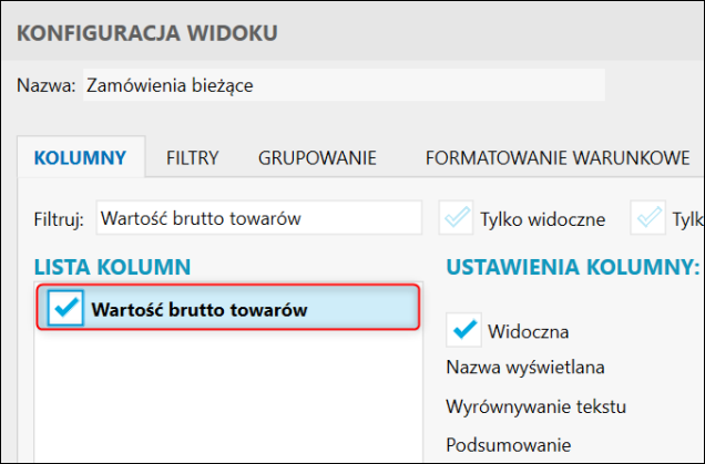 Subiekt nexo – Jak do widoku zamówień dodać kolumnę Wartość brutto towarów?