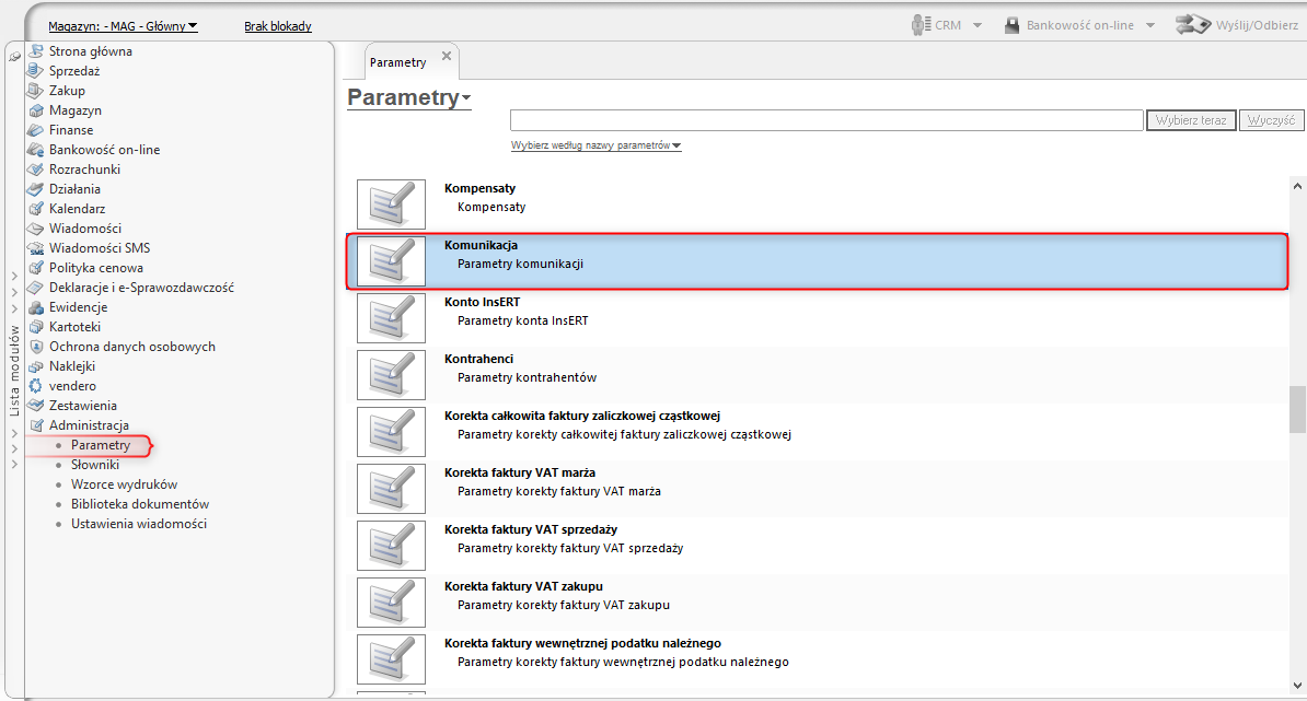 Aby zmienić symbol podmiotu w komunikacji, należy wybrać z listy modułów Administracja – Parametry – Komunikacja.