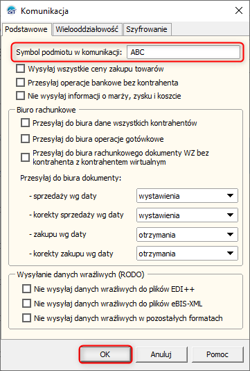 W zakładce Podstawowe uzupełnić pole Symbol podmiotu w komunikacji, wpisując np. ABC. Zmiany zatwierdzić przyciskiem OK.