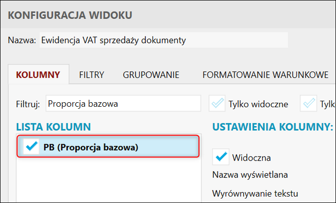 Rewizor nexo – Jak do widoku Ewidencji VAT sprzedaży dodać kolumnę Proporcja bazowa?