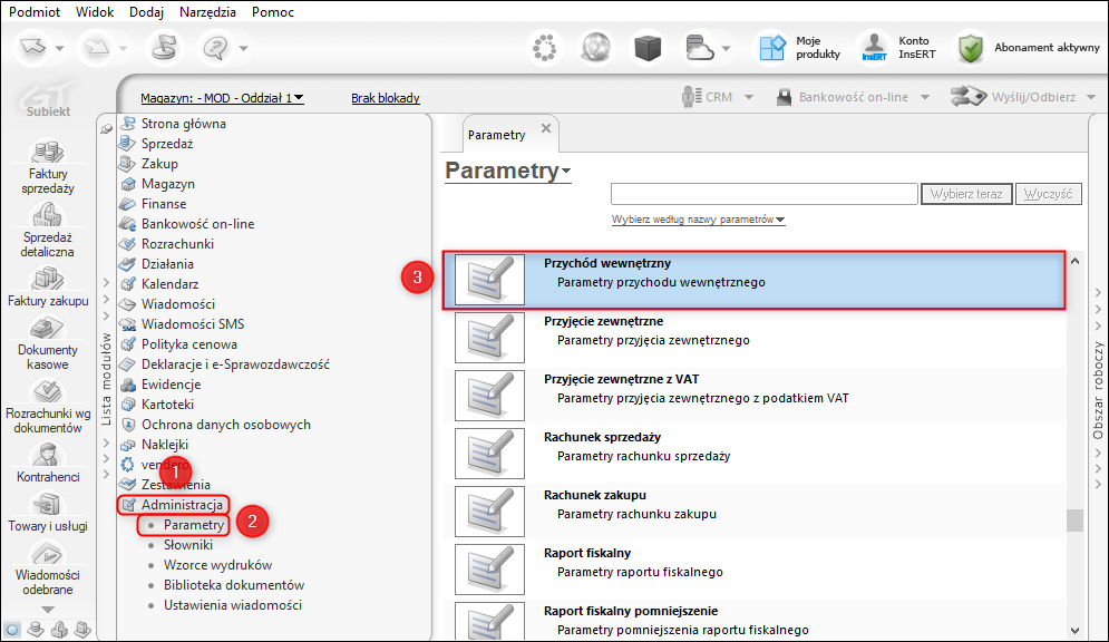 1. Z listy modułów wybrać Administracja – Parametry, a z listy parametrów Przychód wewnętrzny.