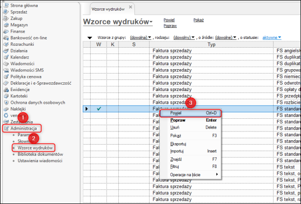 1. Przejść do modułu Wzorce wydruków, zaznaczyć wzorzec FS standard i kliknąć górne menu Powiel.