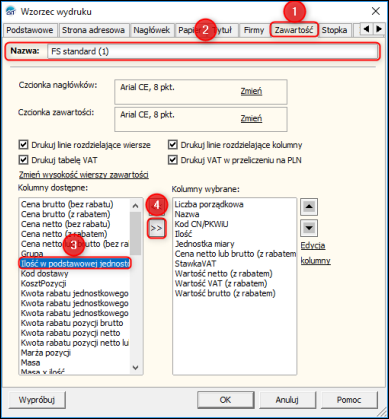 2. Wprowadzić Nazwę nowego wzorca wydruku, przejść na zakładkę Zawartość, w sekcji Kolumny dostępne zaznaczyć kolumnę Ilość w podstawowej jednostce miary i umieścić kolumnę w sekcji Kolumny wybrane używając szarej strzałki skierowanej w prawo.