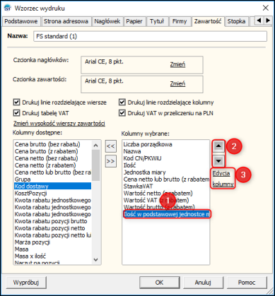 3. Kiedy kolumna znajduje się w sekcji Kolumny wybrane, można ustalić jej położenie względem innych kolumn. W tym celu należy zaznaczyć kolumnę i posłużyć się strzałkami skierowanymi w górę i w dół. Po ustaleniu kolejności drukowanych kolumn przy zaznaczonym polu własnym kliknąć Edycja.
