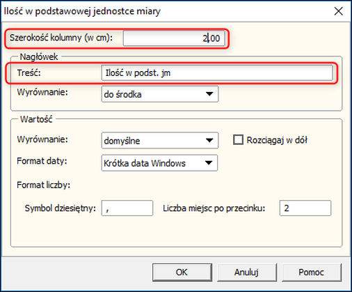 4. W następnym oknie warto ustawić Szerokość kolumny (powinna być ustawiona indywidualnie względem długości wartości kolumny) oraz Treść nagłówka. Po wprowadzeniu tych danych zarówno ustawienia kolumny jak i sam wzorzec wydruku zapisać przyciskiem OK.