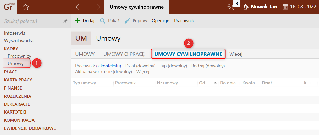 1. Przejść do modułu Kadry – Umowy na zakładkę Umowy cywilnoprawne.