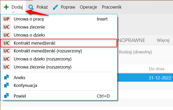 2. Wybrać z górnego menu Dodaj – Kontrakt menedżerski.