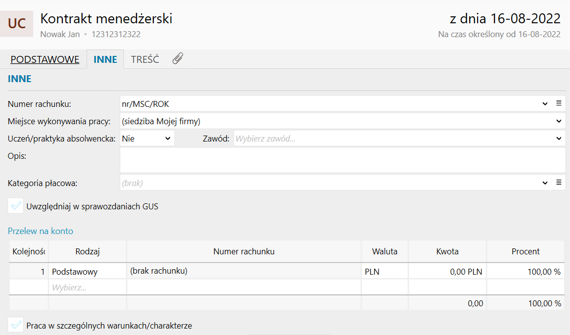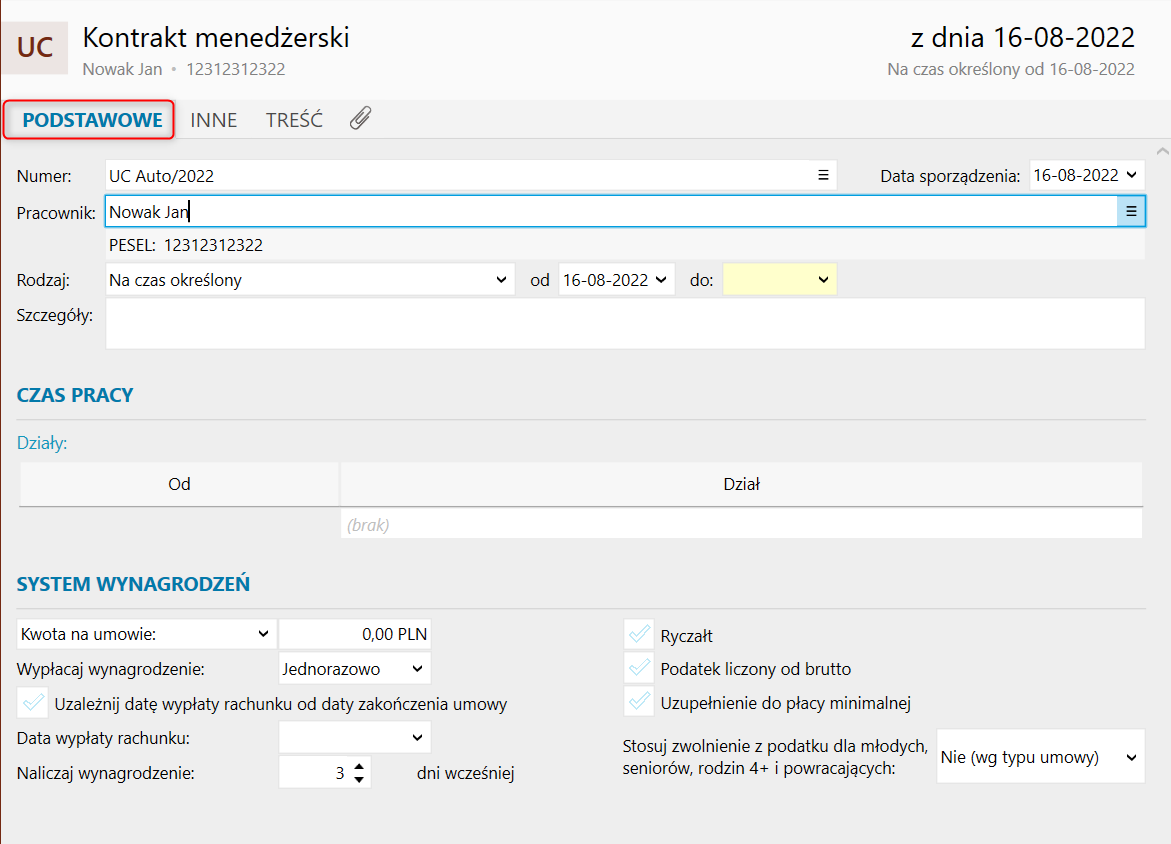 Formatka umowy cywilnoprawnej jest bardzo podobna do formatki umowy o pracę, a różnice występują w sekcjach Podstawowe, System wynagrodzeń, ZUS oraz Podatek. Kontrakt menedżerski jest to umowa zaliczana do umów cywilnoprawnych. Aby dodać ją w programie, należy: