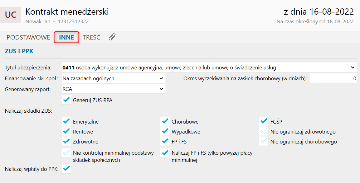 4. W sekcji ZUS i PPK na zakładce Inne w oknie kontraktu menedżerskiego należy uzupełnić dane na potrzeby deklaracji ZUS oraz naliczania wpłat na PPK.