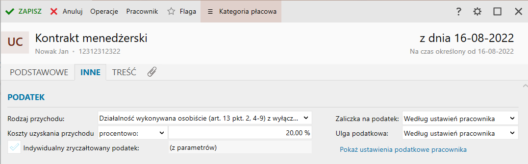 5. W sekcji Podatek znajdują się typowe dla umów cywilnoprawnych ustawienia związane z podatkami. Można określić stawkę zryczałtowanego podatku, rodzaj przychodu, koszty uzyskania przychodu (procentowo lub kwotowo), zaliczkę na podatek oraz miesięczną ulgę podatkową.