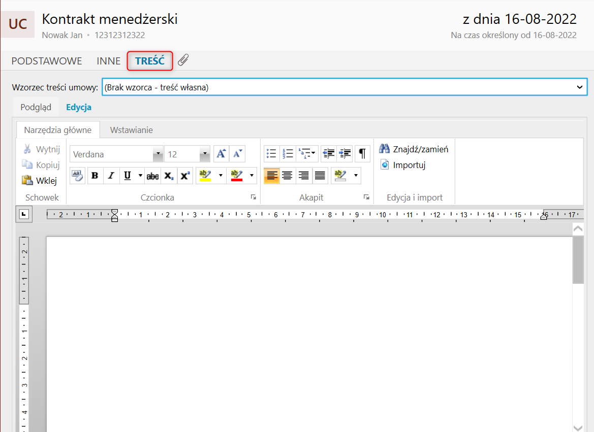 7. Na zakładce Treść okna Kontraktu menedżerskiego można przygotować wydruk kontraktu (korzystając ze wzorca ze słownika Treści dokumentów, na podstawie którego uzupełniony zostanie edytor treści).
