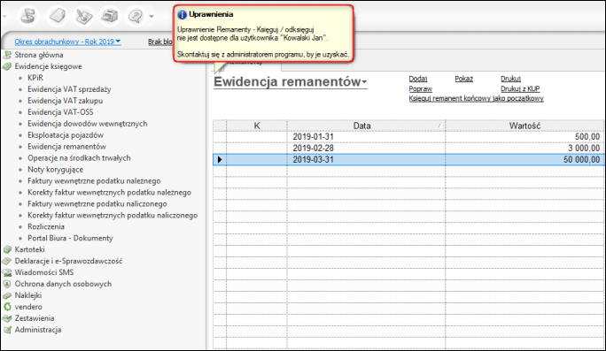 Rezultatem odebrania uprawnień będzie blokada możliwości księgowania remanentów potwierdzona odpowiednim komunikatem.