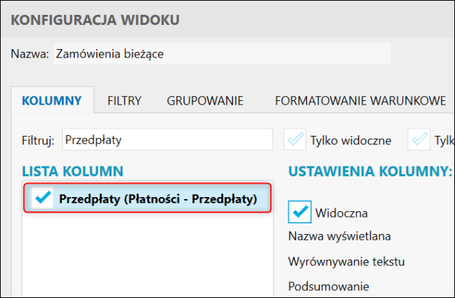 2. Na zakładce Kolumny w polu Filtruj wpisać Przedpłaty, zaznaczyć wyszukaną kolumnę na liście, a zmiany zatwierdzić przyciskiem OK.