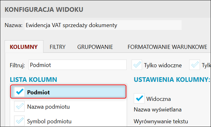 2. Na zakładce Kolumny w polu Filtruj wpisać Podmiot, zaznaczyć wyszukaną kolumnę na liście, a zmiany zatwierdzić przyciskiem OK.