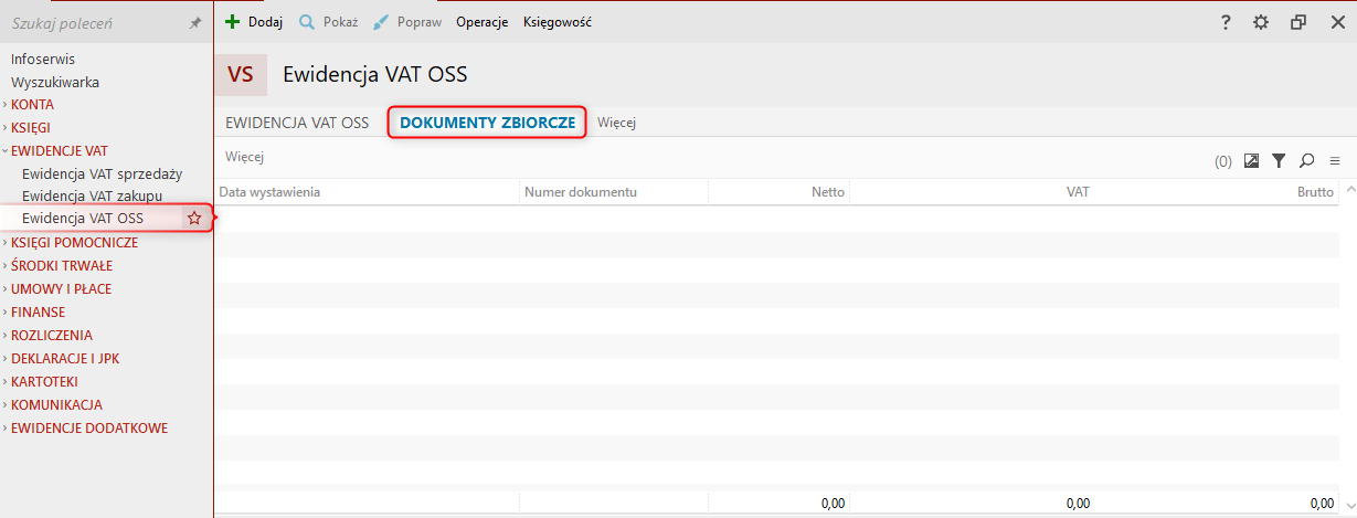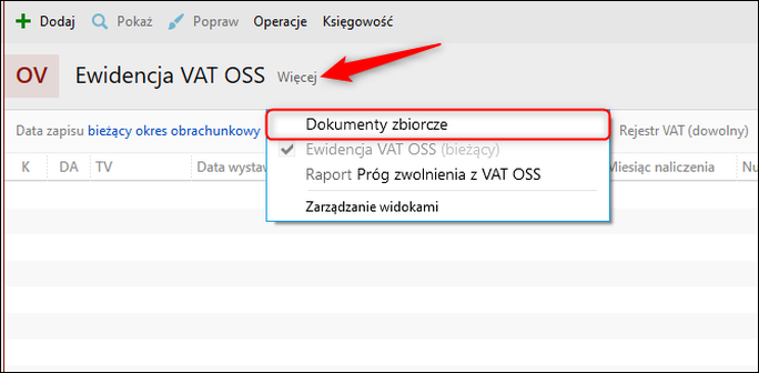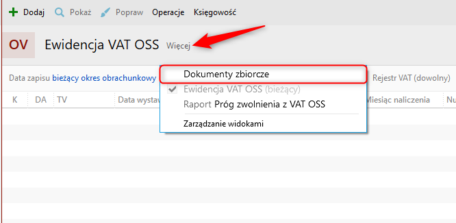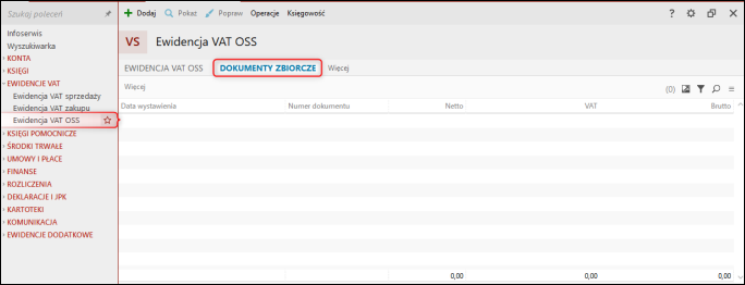 1. Przejść do modułu Ewidencja VAT OSS na zakładkę Dokumenty zbiorcze.
