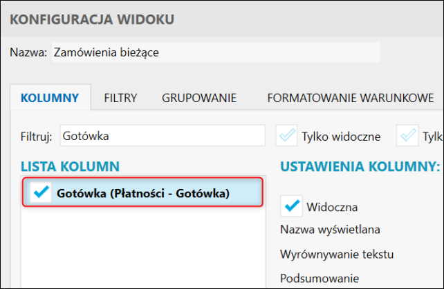 2. Na zakładce Kolumny w polu Filtruj wpisać Gotówka, zaznaczyć wyszukaną kolumnę na liście, a zmiany zatwierdzić przyciskiem OK.