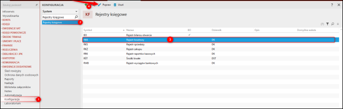 1. Przejść do modułu Konfiguracja – Rejestry księgowe i wybrać Popraw dla istniejącego rejestru lub Dodaj dla nowego.