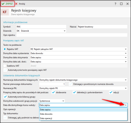 Rewizor nexo – Jak określić datę dla domyślnego kursu waluty rejestru księgowego?