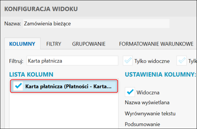 2. Na zakładce Kolumny w polu Filtruj wpisać Karta płatnicza, zaznaczyć wyszukaną kolumnę na liście, a zmiany zatwierdzić przyciskiem OK.