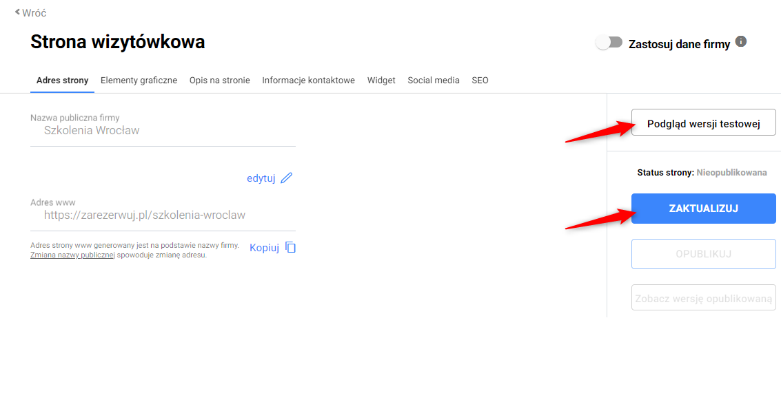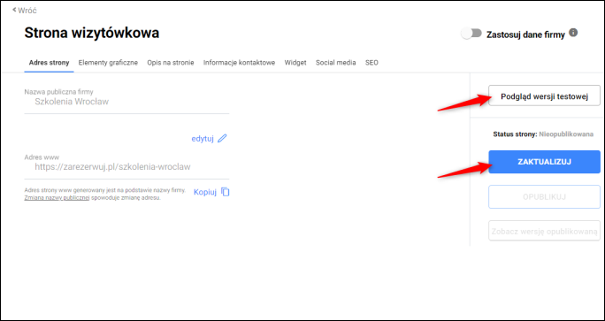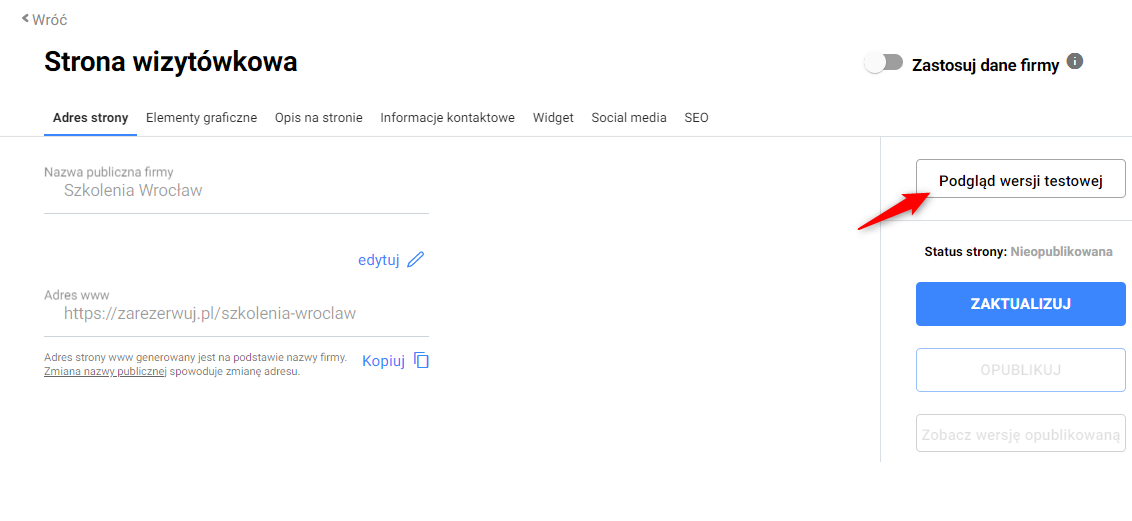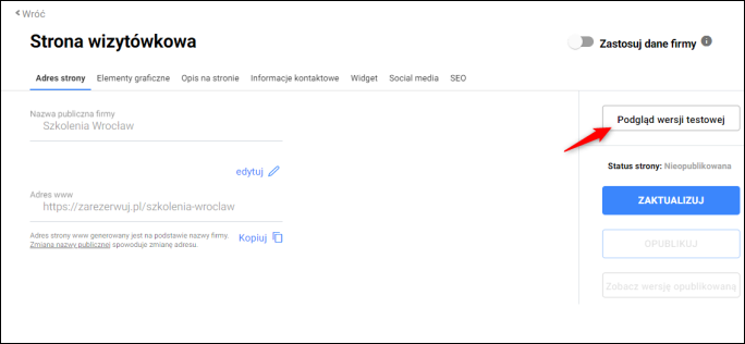 Efekt pracy można podejrzeć, klikając przycisk Podgląd wersji testowej. Aby zapisać zmiany należy kliknąć przycisk Zaktualizuj.