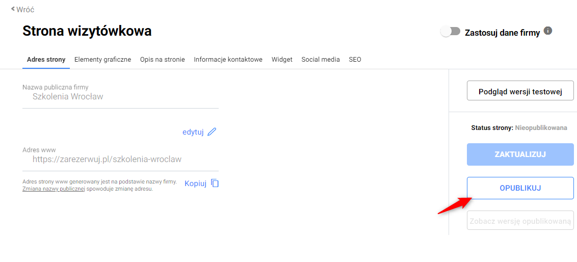 W tej części scenariusza pracy zostanie aktywowana Strona wizytówkowa aplikacji zarezerwuj.pl i zostaną przedstawione możliwości związane z udostępnieniem jej.