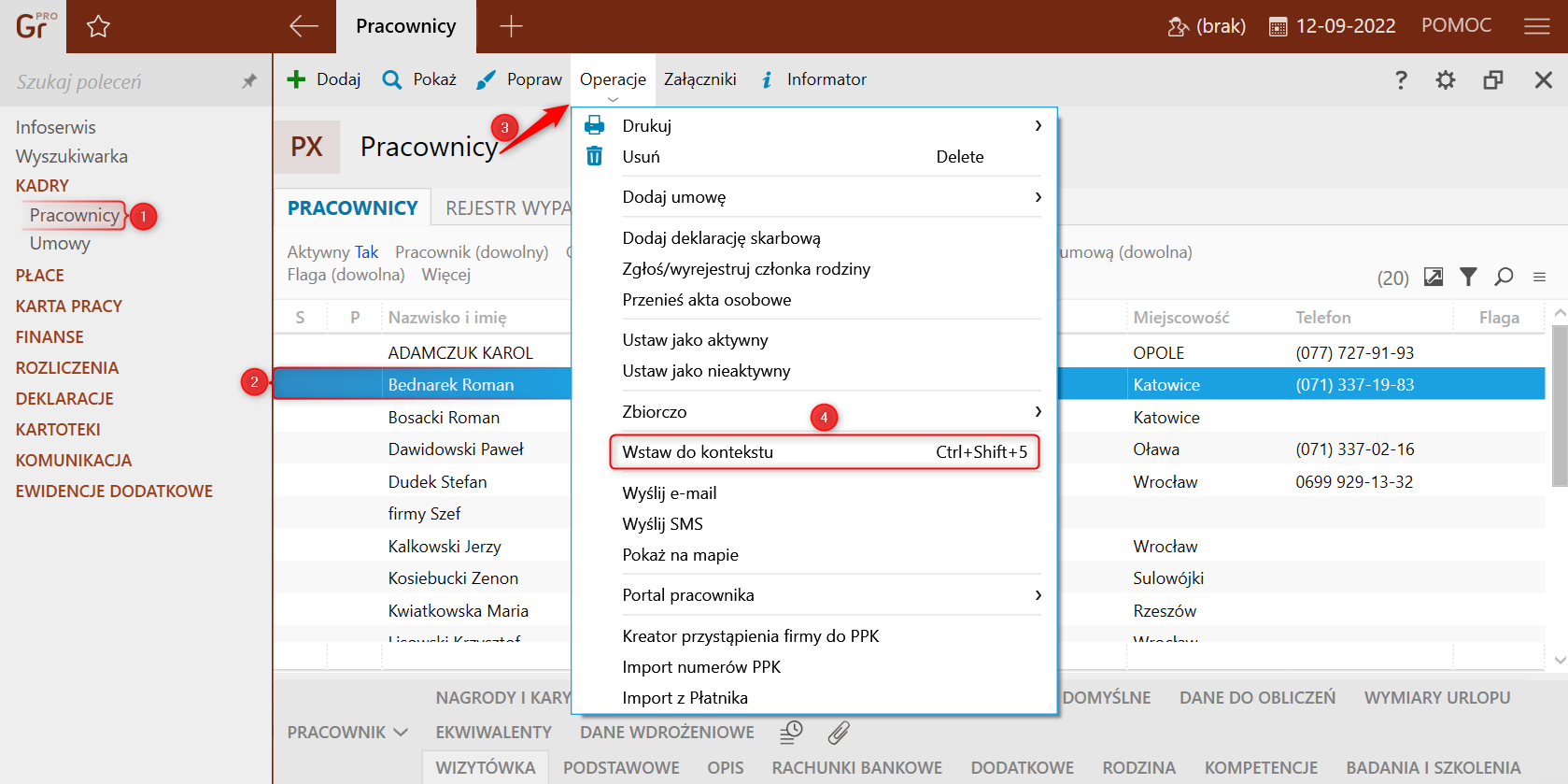 1. Przejść do modułu Pracownicy, zaznaczyć pracownika, a następnie z górnego menu Operacje wybrać Wstaw do kontekstu.​