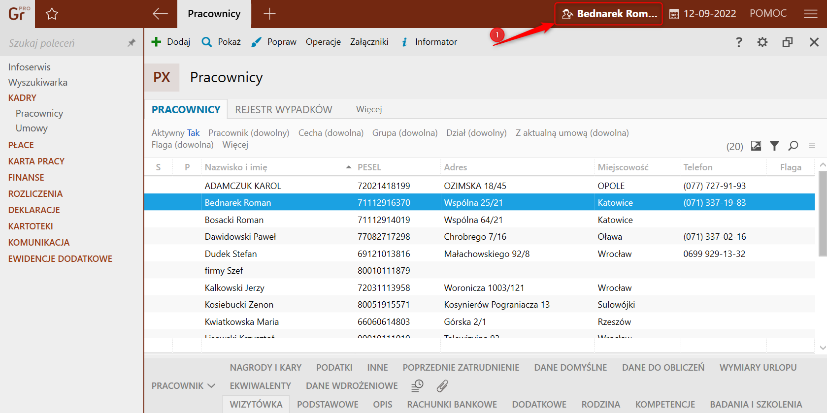 2. Wybrany pracownik pojawi się w kontekście, w górnej części programu na pasku powiadomień. ​​​​​