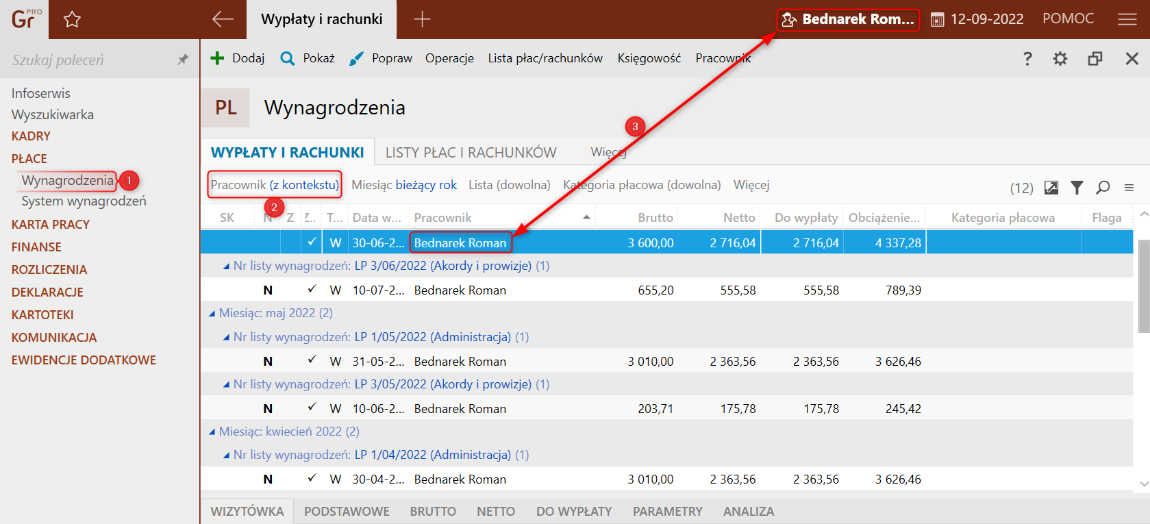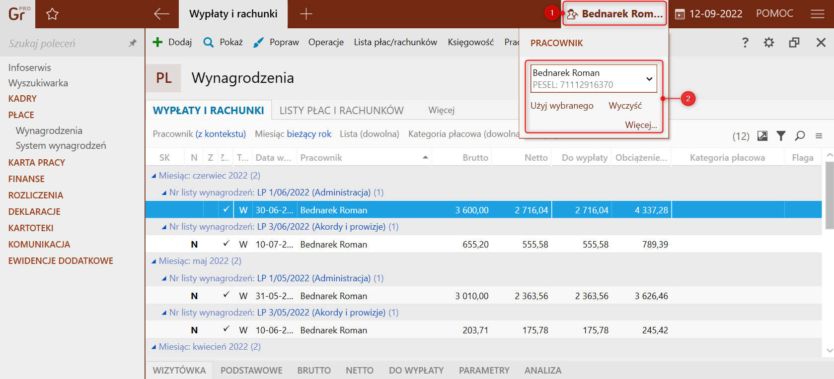 3. Kontekst pracownika może zostać użyty w wielu modułach zawierających dane dotyczące pracowników. Przykładowo, w module Wynagrodzenia, skorzystanie z filtra Pracownik (z kontekstu) wyświetli jedynie wynagrodzenia pracownika aktualnie wybranego w kontekście