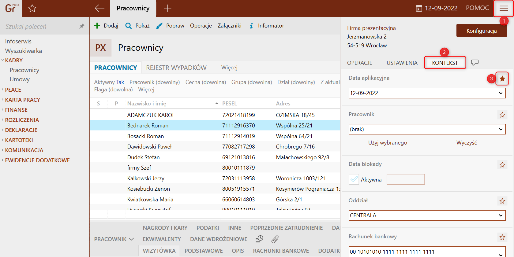 Program Gratyfikant nexo pozwala na wyświetlanie danych dotyczących pracownika wybranego w kontekście ​(przykładowe użycie kontekstu zostało zademonstrowane w punkcie 3 tego artykułu). Z kontekstu ​można korzystać przez wciśnięcie przycisku  w prawej górnej części programu, gdzie na zakładce kontekst istnieje możliwość domyślnego przypisania informacji do paska powiadomień poprzez zaznaczenie gwiazdki.