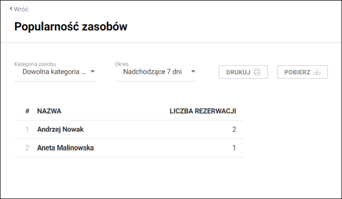 W sekcji Rankingi popularności można wyliczyć dwa raporty, Popularność usług oraz Popularność zasobów. Aby to zrobić, należy przejść do modułu Raporty i kliknąć raport, który ma zostać wyliczony.