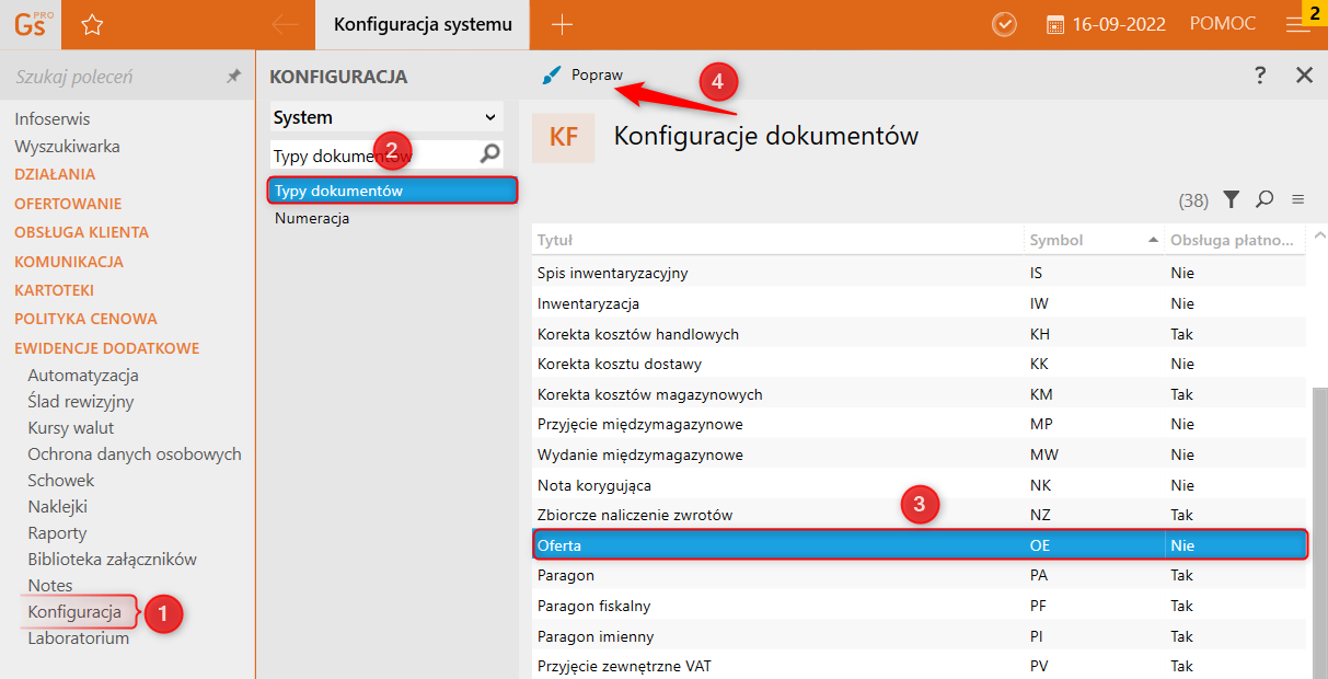 1. Otworzyć konfigurację Typy dokumentów wpisując jej nazwę w lewym, górnym rogu programu i wybierając z listy wyszukanych modułów, zaznaczyć odpowiedni typ dokumentu (w tym przypadku Oferta), po czym kliknąć górne menu Popraw.