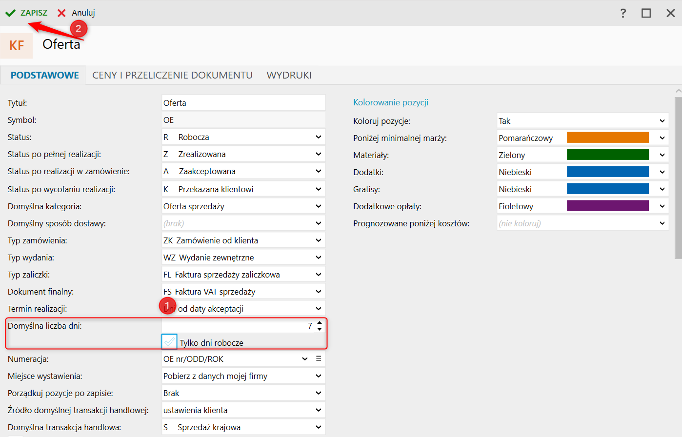 2. W polu Termin realizacji wybrać opcję Dni od daty akceptacji. Dodatkowo użytkownik, może w tym miejscu określić liczbę domyślną liczbę dni. Zapisać zmiany.