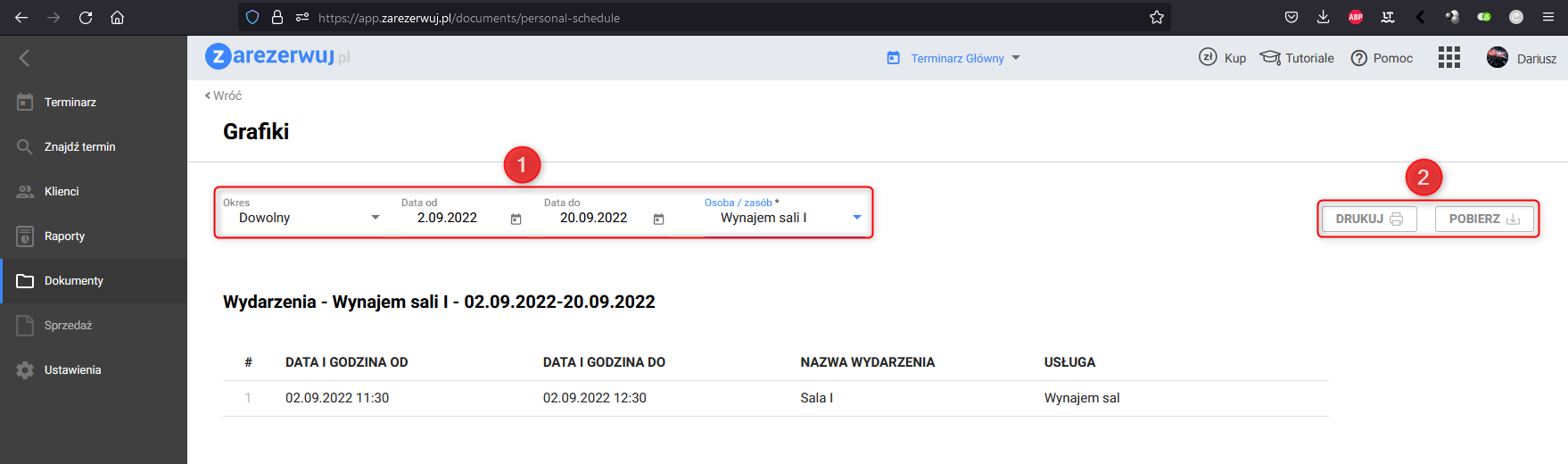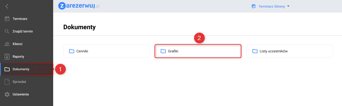 Sekcja Dokumenty w serwisie zarezerwuj.pl służy do generowania dokumentów, takich jak Cennik, Grafik, czy też Listy uczestników. Stworzone w ten sposób dokumenty można drukować lub eksportować do plików o formacie XLS, lub PDF. Aby przygotować Grafik do pobrania/druku, należy: