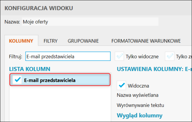 2. Na zakładce Kolumny w polu Filtruj wpisać E-mail przedstawiciela, zaznaczyć wyszukaną kolumnę na liście, a zmiany zatwierdzić przyciskiem OK.
