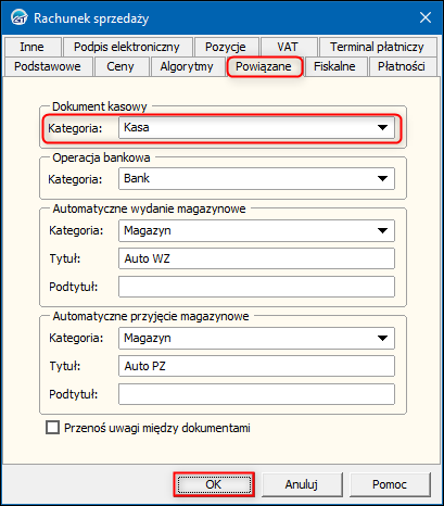 2. W oknie, które się wyświetli przejść na zakładkę Powiązane i wybrać domyślną Kategorię w sekcji Dokument kasowy. Zmiany zapisać przyciskiem OK.