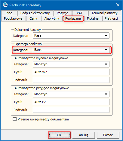 2. W oknie, które się wyświetli przejść na zakładkę Powiązane i wybrać domyślną Kategorię w sekcji Operacja bankowa. Zmiany zapisać przyciskiem OK.