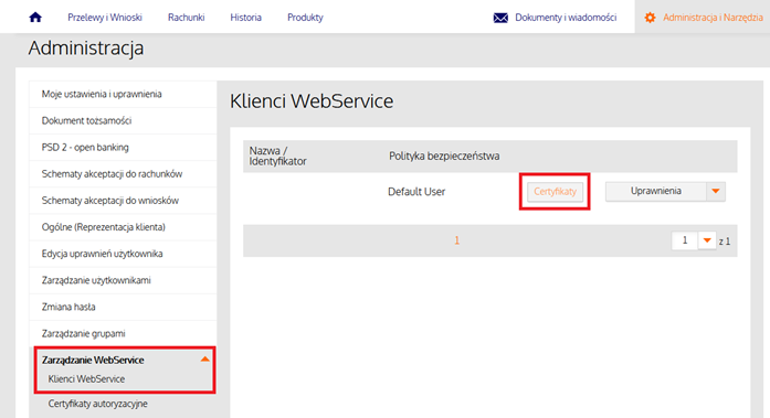 1. Pobrać certyfikat ze strony Banku ING. Można to zrobić poprzez zalogowanie się do systemu ING Business, przejście do Administracja i NarzędziaAdministracja, wybranie z menu bocznego Zarządzanie WebService – Klienci WebServiceCertyfikaty.​