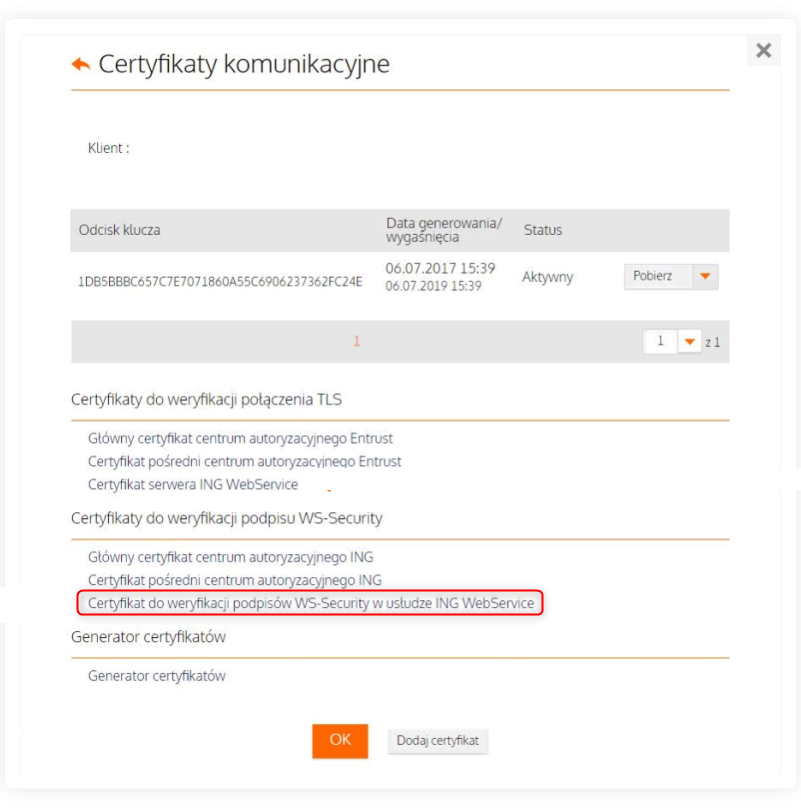 2. Odszukać z listy i pobrać Certyfikat do weryfikacji podpisów WS-Security w usłudze ING WebService