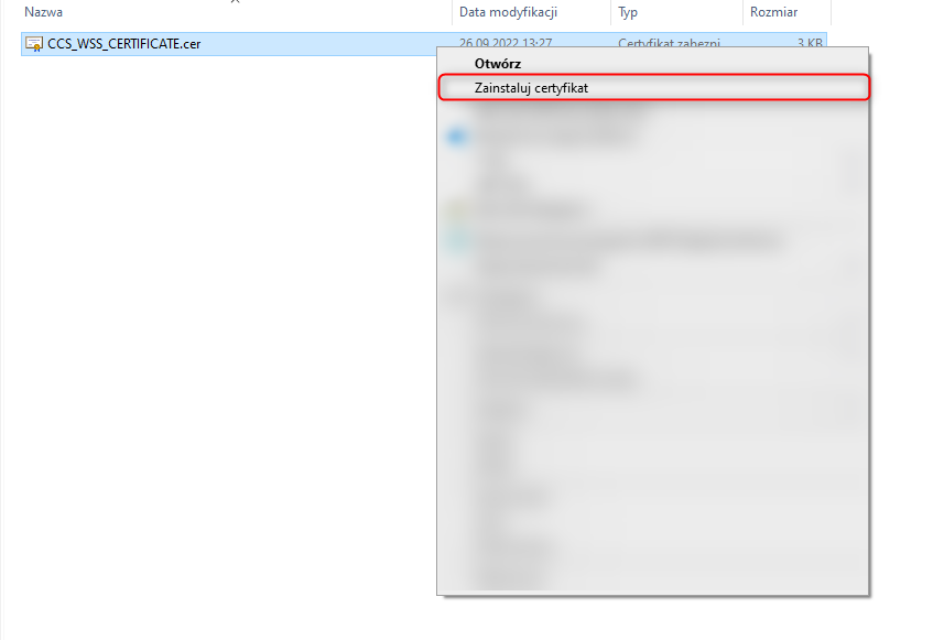 3. Pobrany certyfikat kliknąć prawym przyciskiem myszy i wybrać Zainstaluj certyfikat.